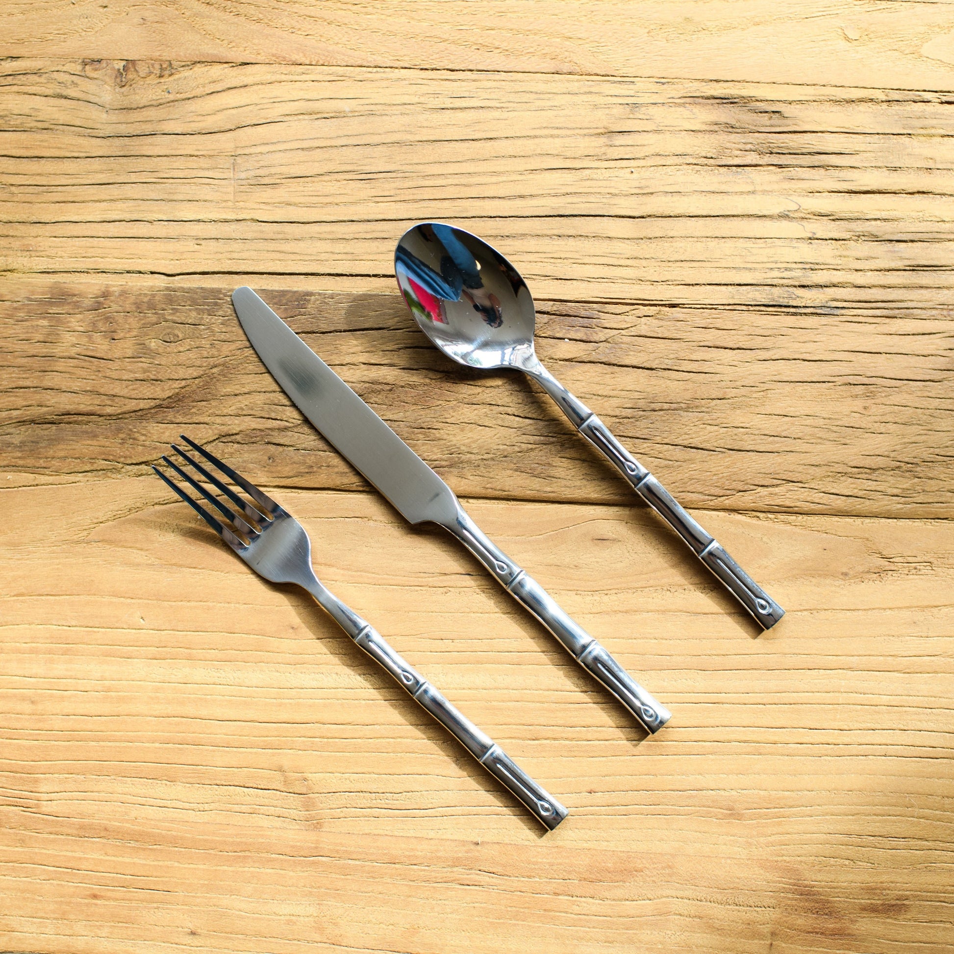 Introducing our 18 Piece Thin Bamboo Cutlery Set in Silver. Sold as a collection of 6 which includes Knife, Fork and Spoon, a total of 18 pieces.